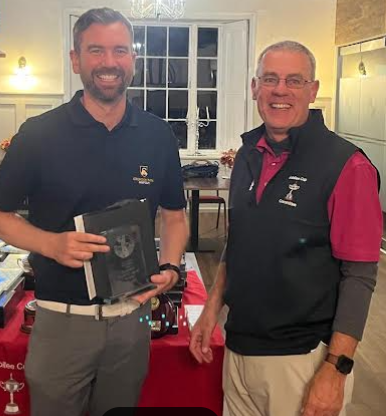 Jim Davis presenting singles order of merit winner JonTalbot from Crondon Park golf club with his trophy